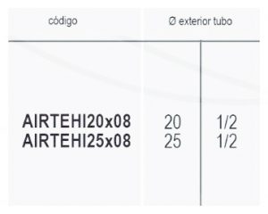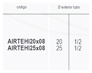 | Código | AIRTEHI20x08 20 – 1/2, AIRTEHI25x08 25 – 1/2 |