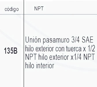 | Codigo | 135B unión pasamuro 3/4 SAE – hilo exterior con tierca x 1/2 – NPT hilo exterior x 1/4 NPT – hilo interior |