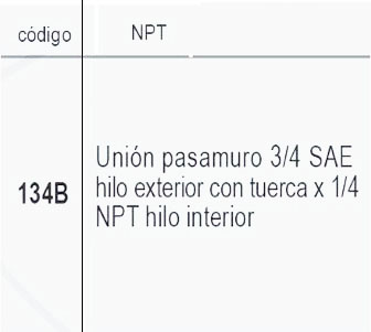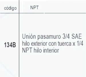 | Codigo | 134B union pasamuro 3/4 SAE – hilo exterior con tuerca x 1/2 – NPT hilo interior |