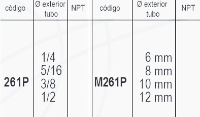 | Codigo | 261P 1/4, 261P 5/16, 261P 3/8, 261P 1/2, M261P 6mm, M261P 8mm, M261P |