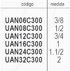 | codigo | UAN06C300 3/8, UAN08C300 1/2, UAN12C300 3/4, UAN16C300 1, UAN24C300 1.1/2, UAN32C300 2 |