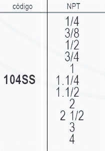 | Codigo | 104SS 1/4, 104SS 3/8, 104SS 1/2, 104SS 3/4, 104SS 1, 104SS 1.1/4, 104SS 1.1/2, 104SS 2, 104SS 2.1/2, 104SS 3, 104SS 4 |
