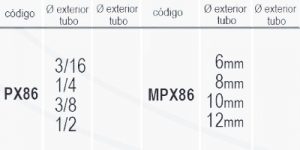 | Codigo | PX86 3/16, PX86 1/4, PX86 3/8, PX86 1/2, MPX86 6mm, MPX86 8mm, MPX86 |