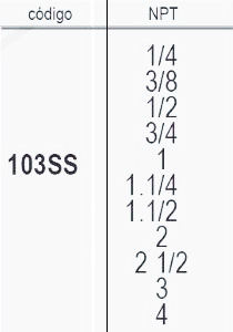 | Codigo | 103SS 1/4, 103SS 3/8, 103SS 1/2, 103SS 3/4, 103SS 1, 103SS 1.1/4, 103SS 1.1/2, 103SS 2, 103SS 2.1/2, 103SS 3, 103SS 4 |