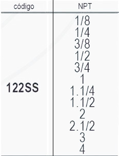 | Codigo | 122SS 1/8, 122SS 1/4, 122SS 3/8, 122SS 1/2, 122SS 3/4, 122SS 1, 122SS 1.1/4, 122SS 1.1/2, 122SS 2, 122SS 2.1/2, 122SS 3, 122SS 4 |