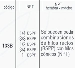 | Codigo | 133B 1/4BSPP – NPT/BSP, 133B 3/8BSPP – NPT/BSP, 133B 1/2BSPP – NPT/BSP, 133B |
