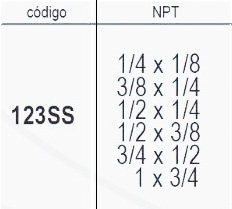 | Codigo | 123SS 1/4×1/8, 123SS 3/8×1/4, 123SS 1/2×1/4, 123SS 1/2×3/8, 123SS 3/4×1/2, 123SS 1×3/4 |