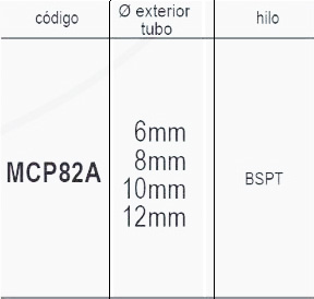 Rango de Medidas: tubo 6mm a 12 mm hilo 1/8 a 1/2 BSPT