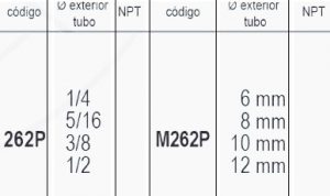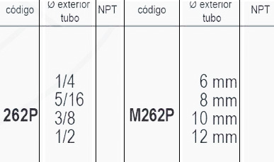 | Codigo | 262P 1/4, 262P 5/16, 262P 3/8, 262P 1/2, M262P 6mm, M262P 8mm, M262P |