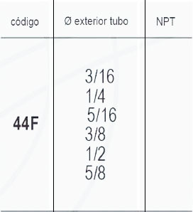 | Codigo | 44F 3/16, 44F 1/4, 44F 5/16, 44F 3/8, 44F 1/2, 44F 5/8 |