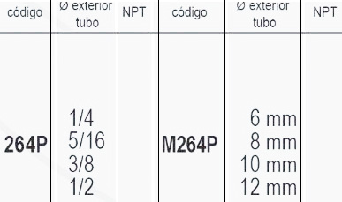 | Codigo | 264P 1/4, 264P 5/16, 264P 3/8, 264P 1/2, M264P 6mm, M264P 8mm, M264P |