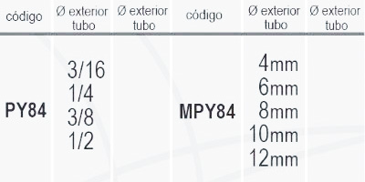 | Codigo | PY84 3/16, PY84 1/4, PY84 3/8, PY84 1/2, MPY84 4mm, MPY84 6mm, MPY84 |
