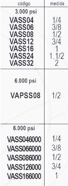 | Codigo | VASS04 1/4, VASS06 3/8, VASS08 1/2, VASS12 3/4, VASS16 1, VASS24 1.1/2, VASS32 2, VAPSS08 1/2, VASS046000 1/4, VASS066000 3/8, VASS086000 1/2, VASS126000 3/4, VASS166000 1 |