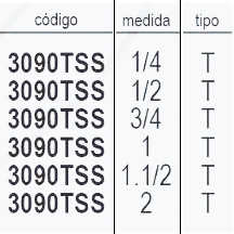 | Codigo | 3090TSS 1/4 – T, 3090TSS 1/2 – T, 3090TSS 3/4 – T, 3090TSS 1 – T, 3090TSS 1.1/2 – T, 3090TSS 2 – T |
