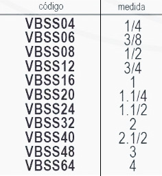 VBSS04 1/4, VBSS06 3/8, VBSS08 1/2, VBSS12 3/4, VBSS16 1, VBSS20 1.1/4, VBSS24 1.1/2, VBSS32 2, VBSS40 2.1/2, VBSS48 3, VBSS64 4