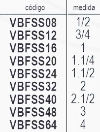 | Codigo | VBFSS08 1/2, VBFSS12 3/4, VBFSS16 1, VBFSS20 1.1/4, VBFSS24 1.1/2, VBFSS32 2, VBFS40 2.1/2, VBFSS48 3, VBFSS64 4 |