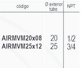 | codigo | AIRMVM20×08 20 – 1/2, AIRMVM25×12 25 – 3/4 |