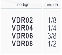 | Medidas | VDR02-1/8, VDR04-1/4, VDR06-3/8, VDR08-1/2 |