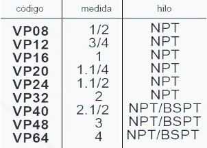 | Codigo | VP08 1/2 – NPT, VP12 3/4 – NPT, VP16 1 – NPT, VP20 1.1/4 – NPT, VP24 1.1/2 – NPT, VP32 2 – NPT, VP40 2.1/2 – NPT/BSPT, VP48 3 – NPT/BSPT, VP64 4 – NPT/BSPT |
