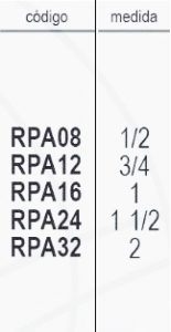 | Codigo | RPA08 1/2, RPA12 3/4, RPA16 1, RPA24 1.1/2, RPA32 2 |