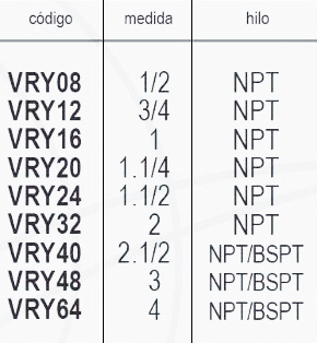 | Codigo | VRY08 1/2 – NPT, VRY12 3/4 – NPT, VRY16 1 – NPT, VRY20 1.1/4 – NPT, VRY24 1.1/2 – NPT, VRY32 2 – NPT, VRY40 2.1/2 – NPT/BSPT, VRY48 3 – NPT/BSPT, VRY64 4 – NPT/BSPT |