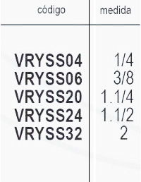 | Codigo | VRYSS04 1/4, VRYSS06 3/8, VRYSS20 1.1/4, VRYSS24 1.1/2, VRYSS32 2 |