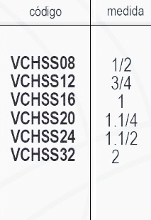 | Codigo | VCHSS08 1/2, VCHSS12 3/4, VCHSS16 1, VCHSS20 1.1/4, VCHSS24 1.1/2, VCHSS32 2 |